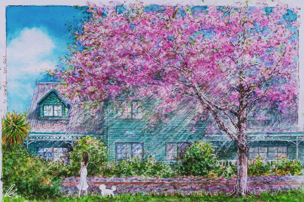 Missing Auckland spring, watercolour painting for vintage house and train. Cherry blossom tree, sakura. and comes up with Japanese anime Artist Hayao Miyazaki style. 朋友,是春天了 驱散忧愁,揩去泪水 向着太阳微笑 …… 好久没画画了,最近画了一副有关樱花的钢笔淡彩 算是一种情绪的宣泄吧希望封城快点结束,大家想干嘛能干嘛去。